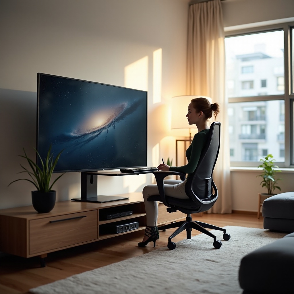 Fyysinen asennus ja kaapelinhallinta: Aseta TV ergonomiseen korkeuteen mukavan katselun takaamiseksi. Käytä tukevia seinätelineitä tai jalustoja, jotka tukevat TV:n painoa. Järjestele kaapelit siististi vähentääksesi epäjärjestystä, mikä edistää puhdasta ja järjestelmällistä ympäristöä.